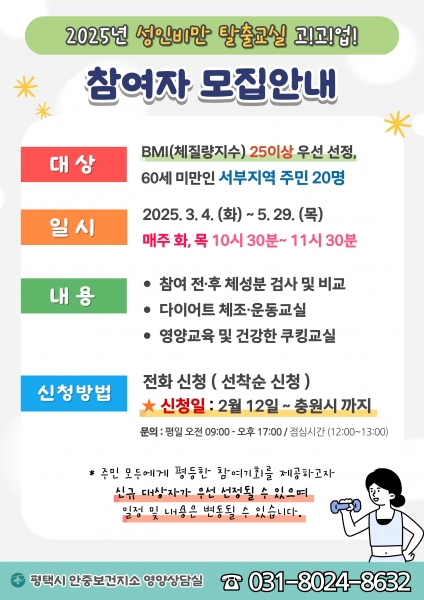 [금요저널] 평택시 안중보건지소에서는 ‘성인비만 탈출교실 고고업’ 프로그램을 오는 3월 4일부터 5월 29일까지 매주 화, 목요일 10:30부터 11:30까지 운영한다.
