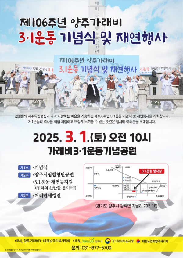 [금요저널] 양주시가 오는 3월 1일 토요일 오전 10시 광적면 가래비 3.1운동 기념 공원에서 ‘제106주년 양주 가래비 3.1운동 기념식 및 재연행사’를 개최한다고 밝혔다.