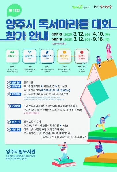 시 관계자는 “시민과 함께 '책 읽는 도시 양주' 실현을 위해 달려온 독서마라톤 사업이 올해로 15회를 맞이했다”며 “2025년에도 많은 시민들이 참여해 독서의 가치를 공유하고 올바른 독서 습관 형성 및 독서 생활화에 기여할 수 있기를 기대한다”고 말했다.