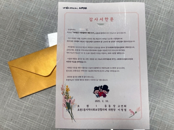 [금요저널] 의정부시 호원1동주민센터는 ‘100일간 사랑릴레이 배턴 잇기’에 참여한 기부자들에게 감사의 마음을 담은 서한문을 발송했다고 13일 밝혔다.