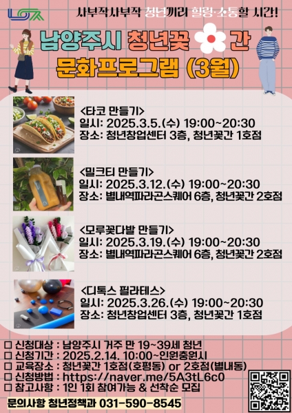 청년꽃간 문화프로그램은 올해 12월까지 지속 운영될 예정이며 남양주시에 거주하는 만 19~39세 청년이라면 누구나 무료로 참여 가능하다.