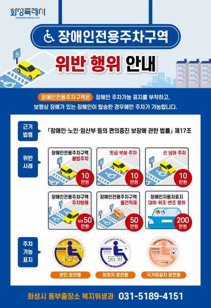 화성시동부출장소는 공동주택 관리사무소 130여 개소에 홍보 안내문 8천 부를 배부하고 그중 장애인전용주차구역 불법주정차 신고다발지역인 20여개소에는 현수막과 포스터를 추가로 배포하는 등 다양한 채널을 이용해 홍보활동을 추진한다는 방침이다.