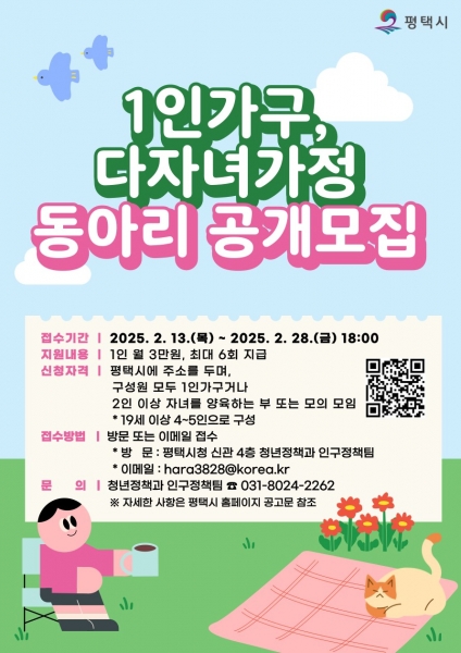 [금요저널] 평택시는 1인 가구 및 다자녀가정 대상 동아리를 2월 13일부터 28일까지 모집한다.