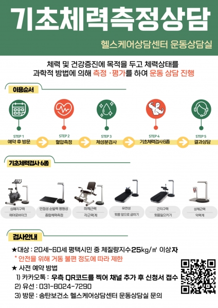두 가지 측정 프로그램 모두 송탄보건소 1층 헬스케어상담센터에서 진행되며 예약은 카카오채널 ‘송탄보건소 건강정보톡’ 신청서 접수 및 유선으로 하면 된다.