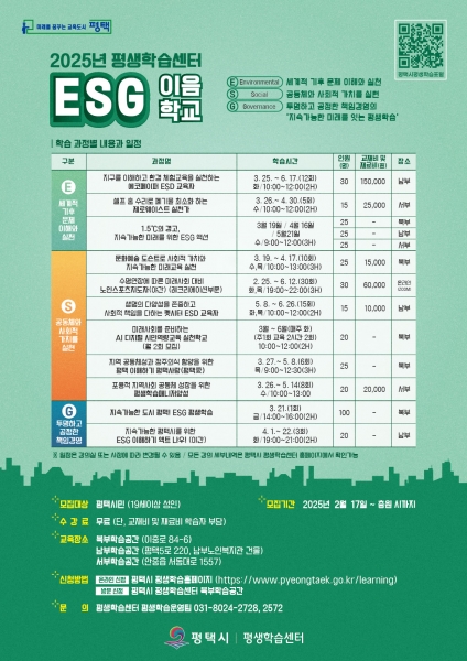 [금요저널] 평택시 평생학습센터에서는 오는 17일부터 ‘2025년 ESG 이음 학교’ 상반기 11개 강좌의 수강생을 모집한다고 밝혔다.