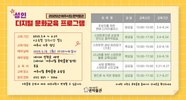 여주시는 2025년 3월부터 6월까지 여주시립 폰박물관에서 성인을 대상으로 한 디지털 문화교육 프로그램을 운영한다.