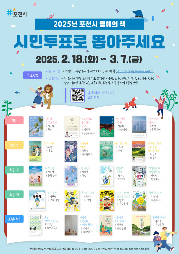 선정된 올해의 책은 2025년 포천시 전국 독후감 공모전, 올해의 책 작가와의 만남을 비롯해 다양한 독서 행사와 프로그램에서 활용 및 소개될 예정이다.