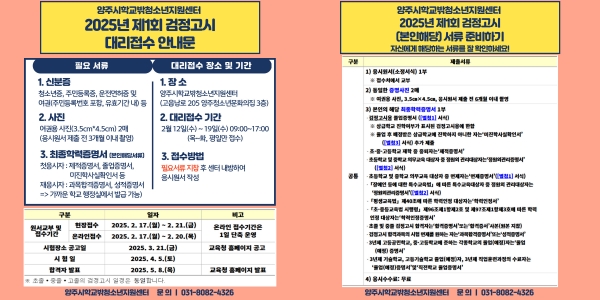 2025년도 제1회 검정고시는 4월 5일에 시행되며 양주시 꿈드림에서는 대리 원서 접수를 2월 13일부터 19일까지 5일 동안 진행한다.