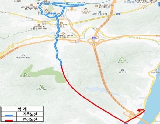 이번 노선연장으로 화도읍 차산리에서 삼봉리 방면 이동 시간이 40분 이상 단축되고 조안면의 △삼봉1리 재재기마을 △부엉배마을 △구봉마을 232세대 주민들의 마석 방면 접근성이 크게 향상될 것으로 기대된다.