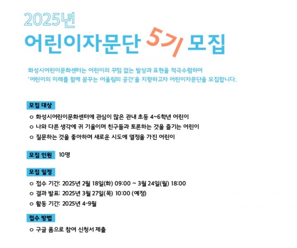 [금요저널] 화성특례시가 어린이들의 참신한 아이디어를 문화센터 운영에 반영하기 위해 화성시어린이문화센터 ‘어린이자문단 5기'를 2월 18일부터 3월 24일까지 모집한다고 18일 밝혔다.
