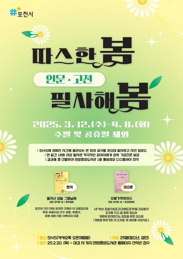 [금요저널] 포천시 면암중앙도서관은 봄을 맞아 3월 12일부터 4월 8일까지 인문고전 필사 프로그램 ‘따스한 봄, 필사해 봄’을 운영한다.