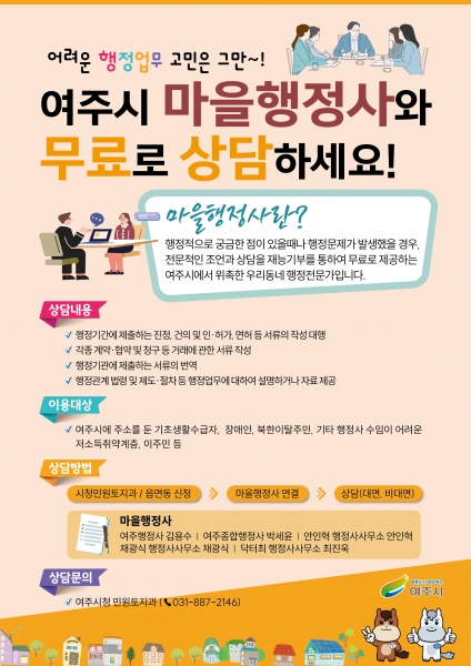 민원토지과 관계자는 “마을행정사 운영을 통해 행정사 수임이 어려운 취약계층에게 도움이 될 것이라 기대하고 이번 서비스를 통해 여주시는 항상 시민들의 곁에서 시민들을 위한 행정을 위해 노력하고 있으며 마을행정사 운영을 통해 어려운 취약계층에게 도움이 될것이라 기대하고 행정 사각지대 최소화에 만전을 기하겠다”고 말했다