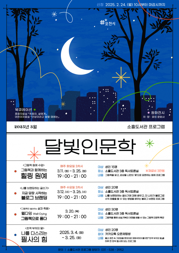 [금요저널] 포천시 소흘도서관은 3월 4일부터 3월 31일까지 야간 인문학 프로그램 ‘달빛 인문학’을 운영한다.