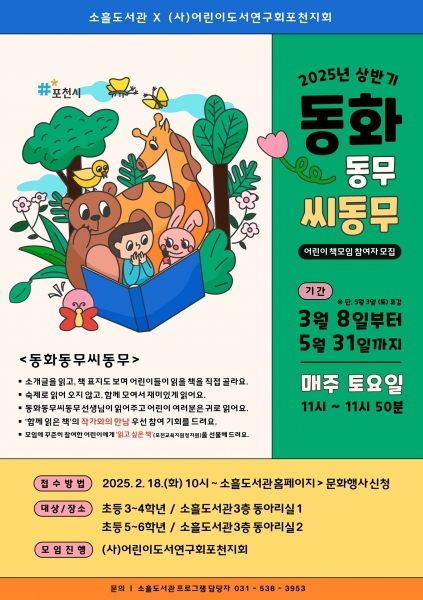 [금요저널] 포천시는 소흘도서관에서 오는 3월부터 5월까지 매주 토요일 오전 11시에 어린이 책모임 ‘동화동무씨동무’를 운영한다.