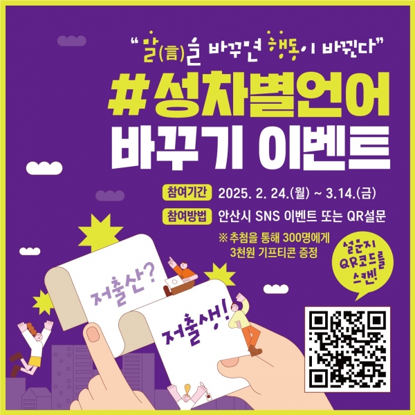 [금요저널] 안산시는 오는 3월 14일까지 시민들의 성평등 언어 사용과 성차별적 표현을 개선하기 위해 ‘#안산, 성차별 언어 바꾸기 이벤트’를 진행한다고 24일 밝혔다.