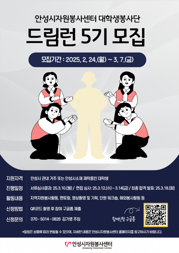 [금요저널] 안성시자원봉사센터는 2월 24일부터 3월 7일까지 대학생봉사단 ‘드림런 5기’를 모집한다고 밝혔다.