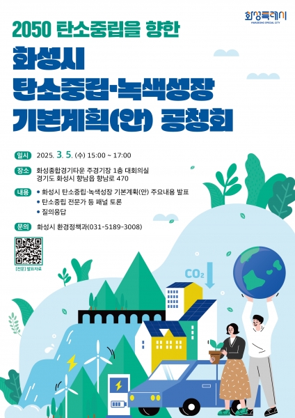 행사는 △온실가스 배출 현황 및 향후 전망 △중장기 감축 목표 설정 △부문별 온실가스 감축 대책 등 ‘화성특례시 탄소중립 기본계획’의 주요 내용을 설명한 뒤, 전문가 패널 토론과 시민 의견 청취 순으로 진행된다.