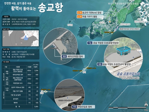 시는 오는 2027년까지 3년 간 국비 35억원을 포함한 총사업비 50억원을 투입해, 송교항 일원에 어업활동을 위한 물양장과 공동작업장을 신규 조성하고 어장진입로와 선착장을 보수하는 등 지역 주민이 장기간 염원해 온 어항 노후환경 및 안전시설 정비를 추진할 계획이다.