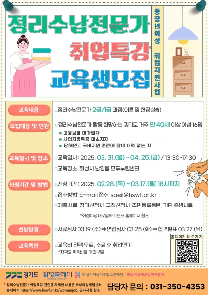 [금요저널] 화성시여성가족청소년재단 화성여성새로일하기센터는 3월 17일까지 ‘정리수납전문가 취업특강’ 교육생을 모집한다고 밝혔다.