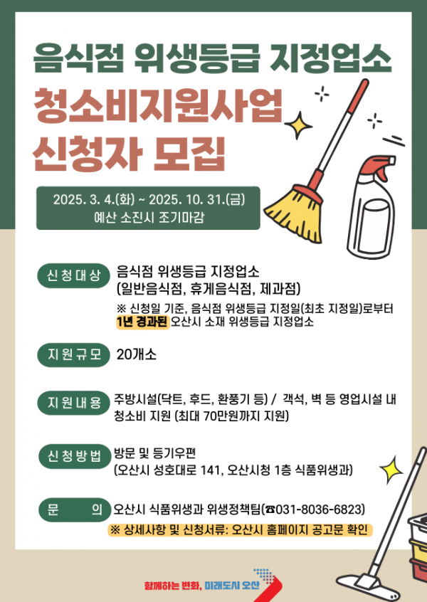청소비 지원을 희망하는 영업자는 오산시청 홈페이지 고시/공고에서 ‘2025년 음식점 위생등급 지정업소 청소비 지원사업 참여업소 모집 공고’를 확인 후 구비서류를 갖춰 오산시청 식품위생과에 방문하거나 우편으로 접수하면 된다.