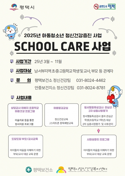 [금요저널] 평택시는 학교 내 정신건강 문제를 경험하는 아동·청소년의 증가에 따라 정신건강에 관심을 높이고 예방을 지원하기 위한 ‘School Care 사업’을 운영한다고 밝혔다.