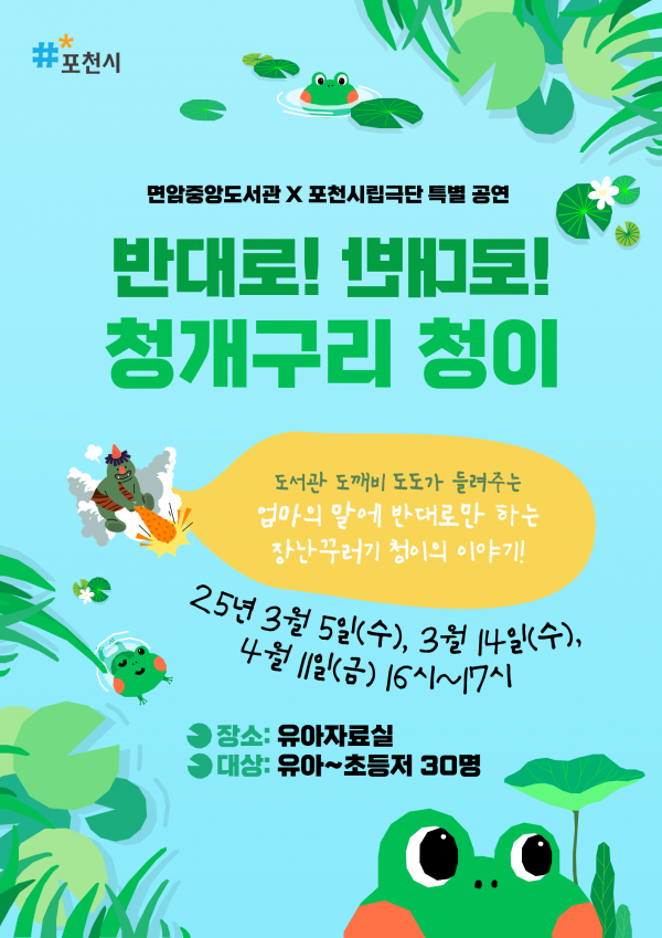 이번 공연은 포천시립극단과 함께하는 문화예술 지원 프로그램의 일환으로 운영되며 창작극 ‘반대로 반대로 청개구리 청이’를 선보인다.