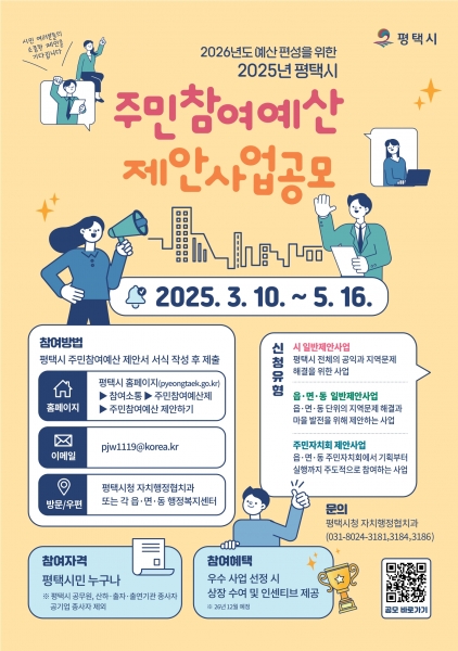 [금요저널] 평택시가 3월 10일부터 5월 16일까지 2026년도 예산 편성을 위한 2025년도 주민참여예산 제안사업 공모를 시행한다.