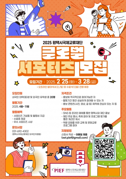 [금요저널] 평택시국제교류재단이 2월 25일부터 3월 28일까지 ‘글로벌 서포터즈’ 20명을 모집하고 있다.