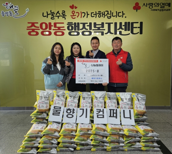 중앙동 백경희 동장은“물향기컴퍼니의 따뜻한 나눔에 깊이 감사드린다”며 “기탁해 주신 백미는 소중히 사용해 꼭 필요한 곳에 잘 전달하겠다”고 감사의 뜻을 전했다.