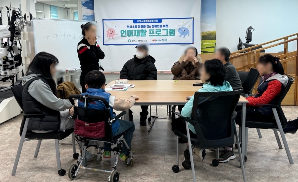언어 재활 프로그램은 전문 언어재활사를 초빙해 의사소통에 장애를 겪고 있는 대상자에게 1회 6명씩 소그룹으로 교육을 진행하며 다양한 방법의 인지적 사고증진을 통해 대상자들의 의사소통 능력을 키우는 프로그램으로 진행한다.