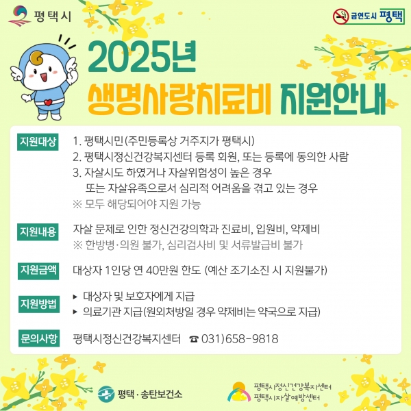 [금요저널] 평택시는 자살 고위험군의 경제적 부담을 줄이고 정신건강의 조기 치료를 지원하기 위해 ‘경기도 생명사랑 치료비 지원사업’을 시행하고 있다고 밝혔다.