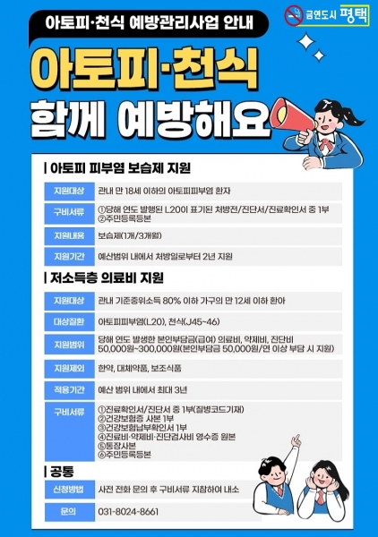 또한, 평택 관내에 아토피피부염 질환이 있는 미성년 환아는 2년간 보습제 지원을 받는 사업이 운영 중이며 필요 서류를 준비해 신청할 수 있다.