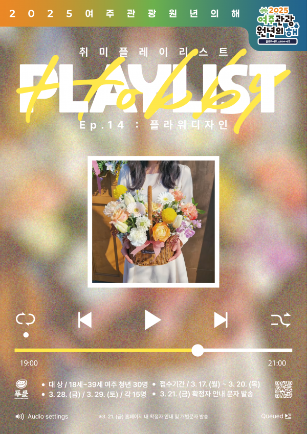 2023년도부터 시작되어 14편의 에피소드를 맞은 이번‘취미플레이리스트’에서는 봄을 맞아 △플라워디자인을 주제로 이론 교육과 더불어 플라워박스를 제작해보는 컨텐츠로 3월 28일 3월 29일 양일간 각 15명의 여주시 청년을 대상으로 한다.