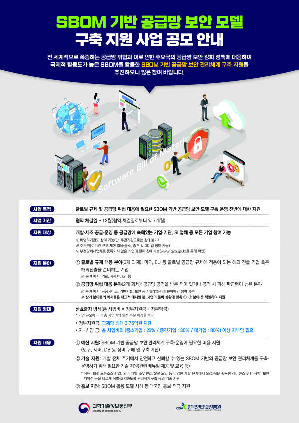 [금요저널] 과학기술정보통신부는 한국인터넷진흥원과 함께 국제적 규제 및 소프트웨어 공급망 위협에 대응하기 위해 국내기업들의 소프트웨어 공급망 보안 관리체계 구축 및 운영 전반에 대해 지원하는 ‘소프트웨어 자재명세서 기반 소프트웨어 공급망 보안모형 구축 지원사업’을 본격 추진한다고 밝혔다.
