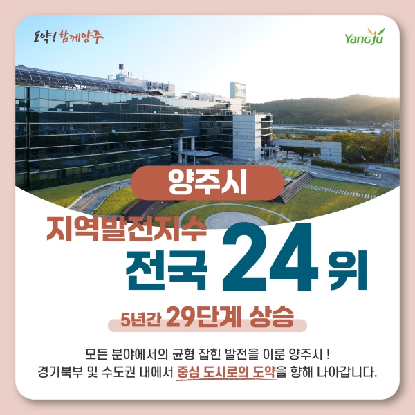 이는 도시 전반의 경쟁력과 그 발전 가능성을 확실히 입증하는 중요한 신호로 옥정·회천 신도시 개발사업을 시작으로 생활 편익 등 주거 가치를 인정받으며 인구가 꾸준히 유입되며 인구 30만을 목전에 두고 있는 양주시는 경제와 산업, 교통이 조화를 이루는 경기북부의 새로운 강자로 자리 잡았다.