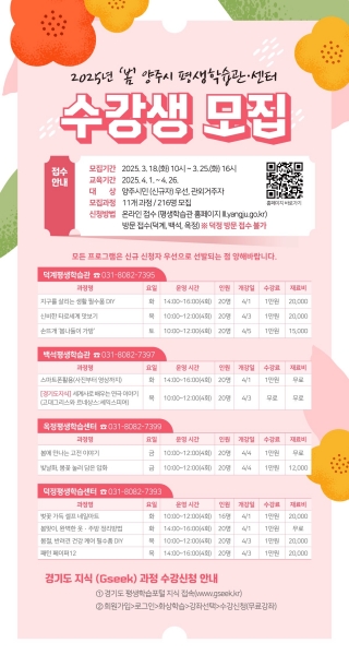 [금요저널] 양주시가 오는 18일부터 25일까지 시민들에게 풍성한 평생교육 기회를 제공하기 위해 마련한 ‘2025년 봄특강’ 수강생을 모집한다고 밝혔다.