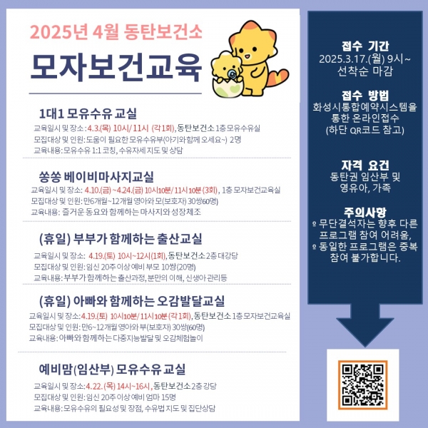 [금요저널] 화성특례시가 건강한 임신·출산과 육아를 지원하기 위해 ‘2025년 4월 모자보건교육 프로그램’ 접수를 17일부터 시작한다.