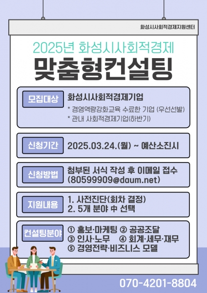 [금요저널] 화성특례시가 ‘2025년 화성시 사회적경제 맞춤형 컨설팅 사업’ 으로 화성시 사회적경제기업의 1:1 맞춤형 지원에 나선다.