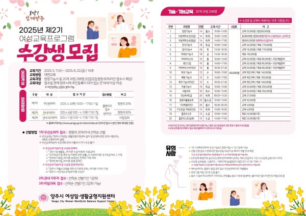 [금요저널] 양주시가 오는 4월 3일부터 17일까지 ‘여성일·생활균형지원센터’에서 ‘2025년 제2기 여성교육프로그램’의 수강생을 선착순 모집한다고 밝혔다.