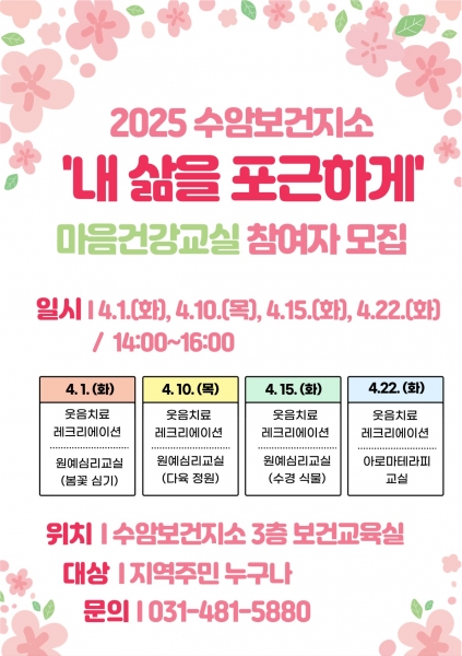 수암보건지소 보건교육실에서 열리는 이번 프로그램은 △4월 1일 △4월 10일 △4월 15일 △4월 22일 등 4번에 걸쳐 진행된다.