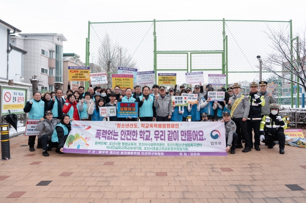이날 캠페인에는 △오산시장 △법무부 청소년 범죄예방위원 오산지구위원회 △오산경찰서 △오산시청소년상담복지센터 △오산시 자녀안심회 △운천중학교 학생자치회 등 다양한 기관과 단체가 참여했다.