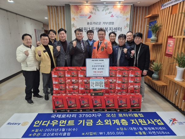 [금요저널] 지난 19일 오산로타리클럽은 대원1동 행정복지센터에 방문해 지역 내 취약계층을 위한 라면 50상자를 기탁했다.