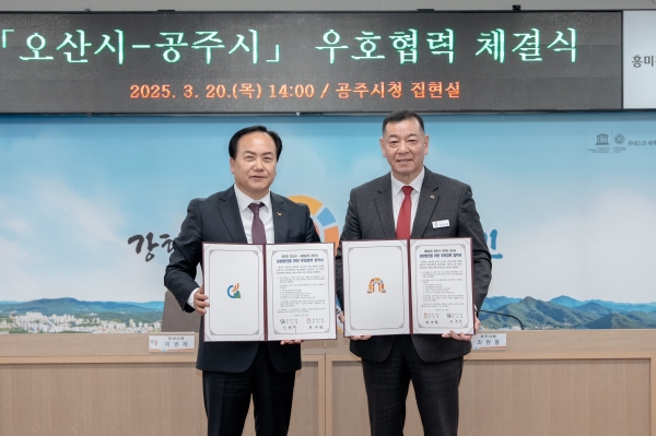 [금요저널] 오산시와 충남 공주시가 20일 공주시청 집현실에서 우호 교류도시 협약을 체결하고 상생 및 공동발전 협력 강화에 나서기로 했다.