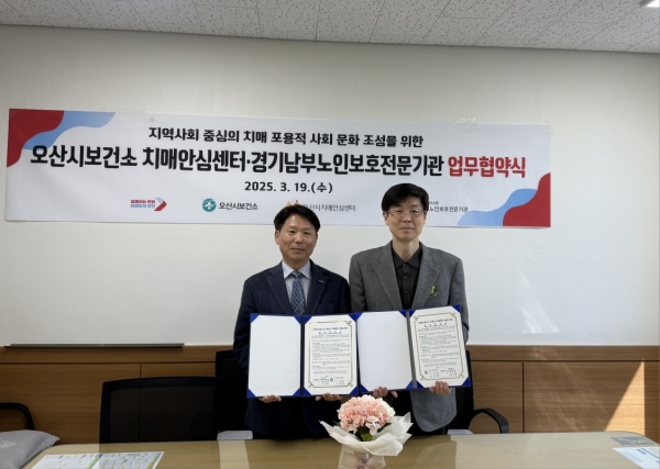 [금요저널] 오산시 치매안심센터는 지난 19일 경기남부 노인보호전문기관과 지역사회 중심의 치매 포용적 사회 문화 조성을 위한 상호 업무협약을 체결했다고 밝혔다.