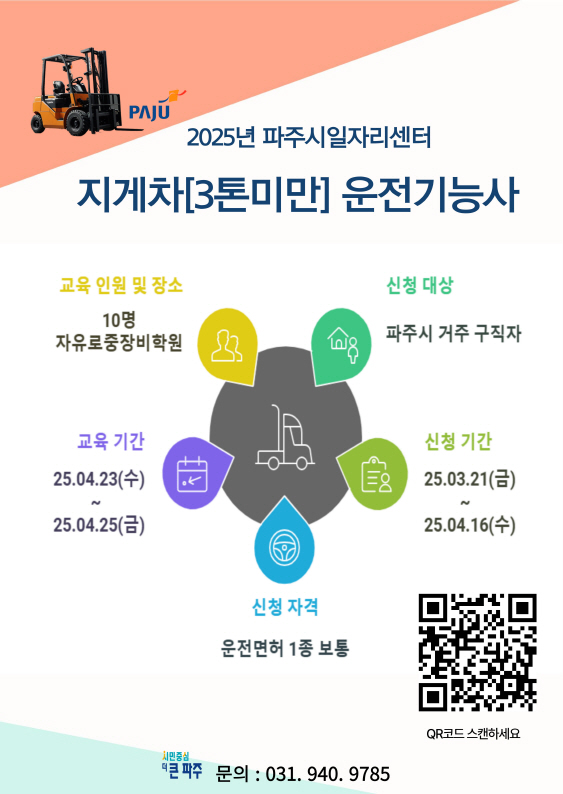 [금요저널] 파주시는 중장년층의 취업 지원을 위해 ‘지게차 운전기능사 과정’ 교육생 10명을 모집한다.