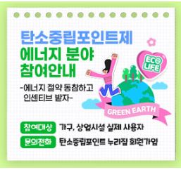 에너지 분야의 경우, 가정·상가 등에서 전기, 도시가스, 상수도 사용량을 최근 2년 평균보다 5% 이상 감축 시, 감축률에 따라 ‘탄소중립포인트’ 가 차등 부여된다.
