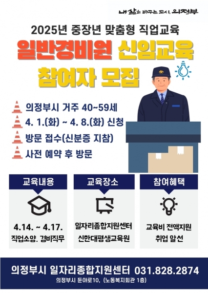 [금요저널] 의정부시는 중장년 구직자를 위한 맞춤형 직무교육으로‘일반경비원 신임교육’ 참여 대상자를 모집한다.