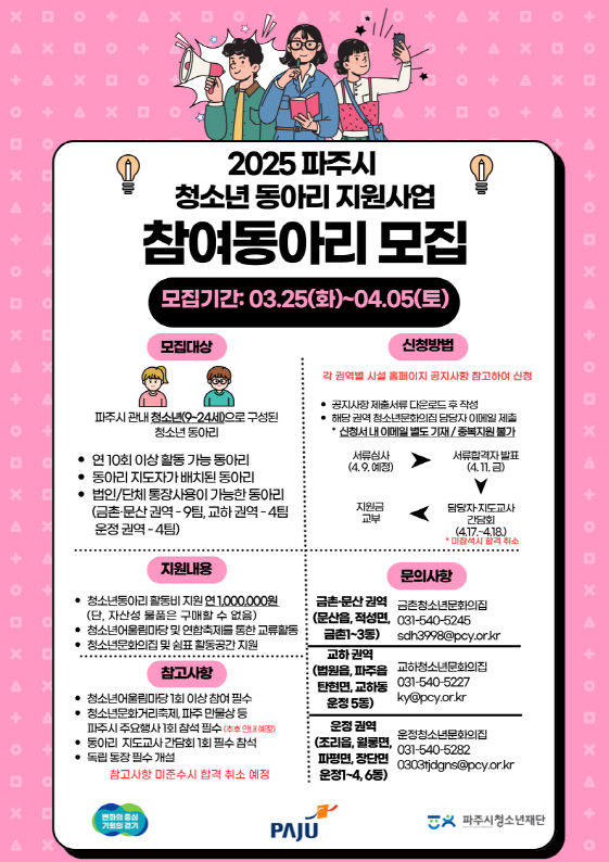 [금요저널] 파주시와 파주시청소년재단은 ‘2025년 청소년동아리 지원 사업’에 참가할 동아리를 4월 5일까지 모집한다.