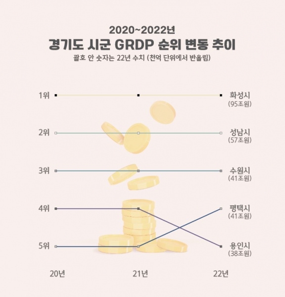 평택시보다 높은 GRDP를 기록한 지자체는 화성시, 성남시, 수원시 등으로 3위를 기록한 수원시와 평택시와의 차이는 571억원에 불과하다.