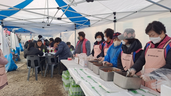 [금요저널] 한국생활개선포천시연합회가 공군 전투기 오폭 사고 피해 현장에서 피해 주민과 자원봉사자를 위한 급식 봉사에 나섰다.
